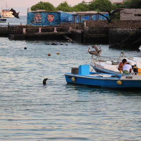 Onze eerste kennismaking met het feit dat de dieren op de Galápagos geen mensenangst kennen. Rond de mooie pier al veel pelikanen en fregatvogels in de lucht met hun welbekende silhouetten. Ons cruiseschip met de welluidende naam Tip Top II bleek luxe en comfortabel; ruime hutten met heerlijke bedden, prima douche, grote ramen. Er was een ruime, koele eetzaal achterin, met een briefing/lounge/lees ruimte voorin. Op het dek erboven was de bar, waar elke dag snacks werden geserveerd. Op het bovendek lagen heerlijke ligbedden onder een overkapping en een ruimte waar kleding kon worden gedroogd. Vanaf het bovendek had je een geweldig uitzicht rondom en hier hebben we dan ook veel tijd doorgebracht. Het was precies wat we gewenst hadden: een comfortabel schip met geweldig personeel om de reis zo aangenaam mogelijk te maken. Na de lunch (we hadden enorme trek na het lange wachten!) was het tijd voor wat uitleg en verkenning op het schip. Ook maakten we kennis met twee Duitse passagiers die al een vijfdaagse duiktrip erop hadden zitten. Daarna volgde onze eerste middagexcursie: een bezoek aan het Darwin onderzoekscentrum. We kregen uitleg over het onderzoek naar met name de Galapagos schildpadden en de vinksoorten. Lonesome George woonde hier tot aan zijn dood in 2012. Er wordt nu een ruimte gebouwd waar hij kan worden tentoongesteld (hij is gebalsemd en is nu nog in New York). Een interessante eerste excursie. De terugweg door Puerto Ayora liet ons een zeer toeristisch dorp zien met een vissershaventje waar zeeleeuwen en pelikanen een visje probeerden mee te pikken.