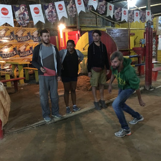 En wat doe je dan aan het eind van zo'n dag, na al die indrukken? Juist, je speelt een spelletje Tejo met de locals. Vanaf een afstand van 15 meter - in ons geval maximaal 8 - gooi je een zware metalen schijf in een bak met dikke klei. In die bak ligt een zware metalen ring, waarop een stuk of wat papiertjes met buskruit liggen. Als de metalen schijf de metalen ring raakt, en het papiertje met buskruit zit er tussen, heb je een enorme explosie en een kleine fik. Natuurlijk is dit een sport waar je veel bier bij moet drinken. Gezien zijn superieure hand-oog-coördinatie was Arjan hier natuurlijk steengoed in. Helaas was dat niet genoeg om mijn motorische handicap goed te maken. Ik vond het al een hele opgave om die bak met klei te raken.