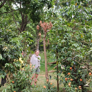 Eerst langs de prachtige planten met o.a. orchideeƫn, die in allerlei creatief bedachte "bloempotten" waren gestopt: een oude broodrooster, een oude radio, een oude pan, een spaarvarken, een damestasje, een teenslipper, een koeienschedel. Heel grappig. Na de tocht langs de mandarijnen- en bananenbomen met de koffieplanten eronder werd de versgemalen koffie geproefd.
