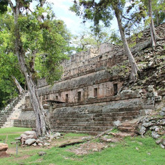 2. De kleinere gebouwen, voor iedereen toegankelijk, en de beroemdste vondst in Copan: een trap van 72 treden, compleet bedekt met hiëroglyfen, die het verhaal vertellen van de heersers van Copan. De langste tekst ter wereld, wordt wel gezegd. En je zou denken, wie schrijft die blijft, maar dat valt dus tegen. Ook in dit centrale deel van de site vind je het veld van het ‘balspel’, dat je eigenlijk bij elke site wel vindt. Dat balspel intrigeert me enorm. Ik stel me een soort zwerkbal voor, en hoop nog steeds dat we ergens live in actie gaan vinden. Tot nu toe moeten we het doen met dit filmpje.