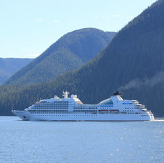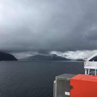 De bemanning werkte elke dag de route bij, zodat je kon zien welke havens er werden aangedaan, en hoe laat. We vonden het wel een beetje raar dat onze bestemming, Sitka, niet op de route stond. Bij navraag bleek dat een aanleghaven van de terugreis te zijn: Eerst zouden we helemaal naar Skagway gaan, het noordelijkste puntje van de vaarweg, en dan weer terug, naar Sitka. Het was geen straf; donkere wolken en flarden van mist gaven de tocht naar het noorden, door het Wrangell kanaal, een onheilspellend tintje. Arjan trotseerde dapper de kou en de regen, en legde als enige op het dek de eenzame schoonheid van Alaska vast. En een aantal vogels.