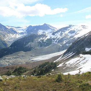 De weg van Squamish naar Whistler is heel spectaculair en voert langs wilde bergbeken, grote watervallen, spitsvormige bergen met de mooiste uitzichten. Dichter naar Whister toe zagen we veel deelnemers aan de Ironman die zich al fietsend aan het voorbereiden waren op de wedstrijd van de volgende dag. Eenmaal in Whistler aangekomen bleken alle parkeerplaatsen in het dorp propvol en zo werden wij naar een parkeerplek bergop verwezen. Gelukkig niet heel veel verder. De Baby Galactica (onze rental) werd gestald en we namen onze daypacks met tent en voedsel en daalden af terug naar het centrum. Een typisch wintersport plaatsje met veel Duits/Zwitserse stijl architectuur (waarom toch altijd?) en heel veel (berg)wandelaars, mountainbikers en dagjesmensen. We sloten aan in de rij naar de skilift en kochten ons ticket. De skilift voerde ons naar een tussenstation waar we overstapten op een stoeltjeslift. De techniek van het instappen in een stoeltjeslift moesten we even ophalen. De mutsen gingen op en op de top aangekomen genoten we van het uitzicht.
