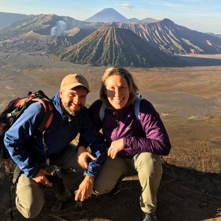 Afijn wij waren die ochtend vroeg onderweg naar de vulkaan en het beloofde een mooie zonsopkomst te worden gezien de fonkelende sterrenhemel die nacht. We reden omhoog de tegenovergelegen berg op om bij het uitzichtpunt aan te komen. Het was daarna nog een 10 minuten stijl omhoog lopen vanaf het punt waar geen auto's meer kunnen rijden. We sloegen nog wat aanbiedingen van muilezel transport af en installeerden ons om de zon te zien opkomen bij de vulkaan. Het was magisch: de tweelingvulkaan werd langzaam zichtbaar met het omringende bizarre maanlandschap. Af en toe zagen we een rookpluim na een eruptie omhoog komen. Ook de Semeru vulkaan even verderop liet kleine erupties zien (het Bromo Tengger Semeru-Arjuno biosphere reserve is erkend door UNESCO). De ligging en het (zon)licht maken het uitzicht op de Bromo vulkaan en de achterliggende vulkanen zo bijzonder.