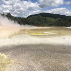 Thermal Wonderland bestaat uit een wandeling van misschien 3 kilometer, langs een veelheid van vulkanische wonderen, met toepasselijke namen. We zagen een bubbelend meer, de “Champagne Pool”, een groen meer met rode randen, en de lichtblauwe ‘oester’ pool. Er waren hele vlaktes waar de aardkorst er uit zag als gedroogde en gebarsten klei. Misschien wel het meest bijzondere meer was het laatste; een neon-groen-geel meer. Ik was klaar om moeder natuur te vergeven - die geiser was misschien niet helemaal on-the-clock, maar met deze show maakte ze veel goed.
